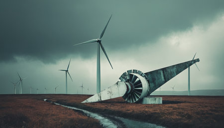 Abandoned wind turbine in a dramatic landscape with moody sky.