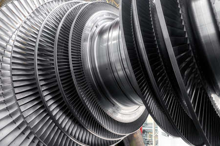 Shaft with numerous blades of modern steam turbine at plant