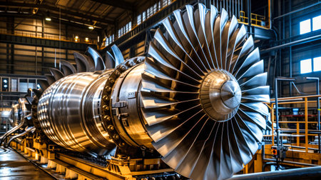 Close-up view of a large industrial turbine engine showcasing intricate details of its blades and central hub. the image highlights the engineering marvel of turbine technology, emphasizing its application in power generation and the energy industry. Generative AI