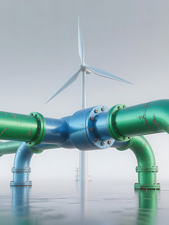This captivating image features a wind turbine emerging from a thick mist, creating a mysterious yet serene atmosphere over calm water. The silhouette against soft light captures the essence of renewable energy and natural beauty.