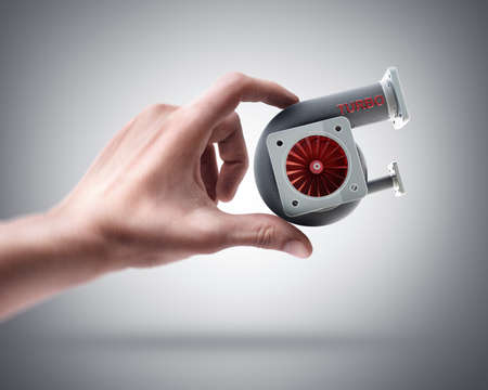 An old reconditioned car turbine, turbocharger, with red and blue lighting.