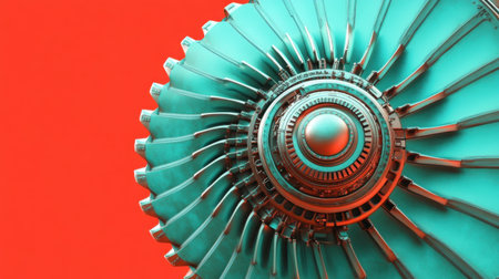 This image features a detailed view of a gas turbine engine component, highlighting its metallic texture against a bright red background.