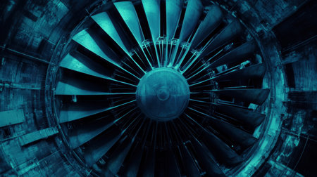 This striking image showcases a close-up view of jet engine turbine blades illuminated in blue tones, highlighting the intricate design and technology of aviation engineering.