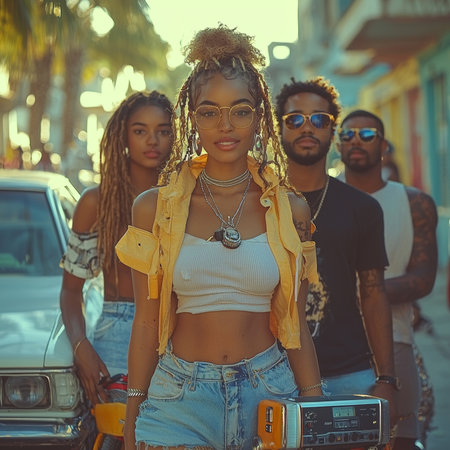 Young individuals in vibrant clothing and vintage accessories enjoy a sunny outing with camaraderie and style.