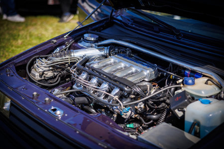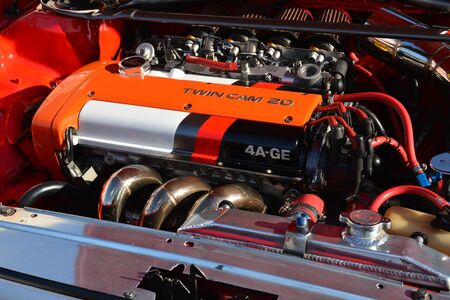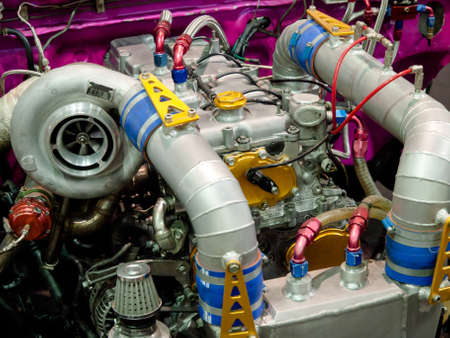 Belgorod , Russia - AUG, 18, 2018: Modification of the turbo engine Close up details of car motor.