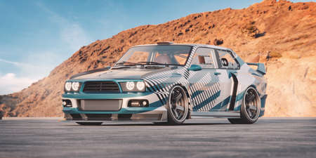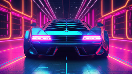 Sport car in neon light. 3d rendering. Computer digital drawing.