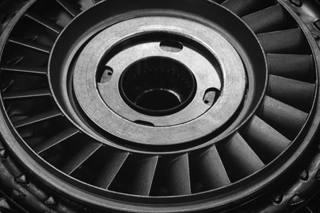 A close up of a black and gray engine turbine part. Concept of mystery and intrigue, as the viewer is left to wonder about the inner workings of the engine and its purpose