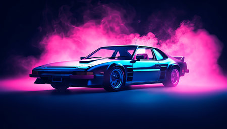 A sleek car drifts on a smooth surface, creating vibrant pink smoke around it. The urban environment is illuminated, highlighting the dynamic movement and excitement of the scene.