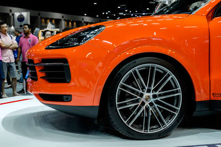 Bangkok, Thailand - December 1, 2019: The 21-inch wheel of bright orange Porsche Cayenne Coupe showcase at the Thailand International Motor Expo 2019 at Impact Challenger Hall