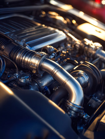 Detailed shot of a precision-engineered powertrain featuring gleaming metal parts and intricate piping, evoking speed and engineering mastery.