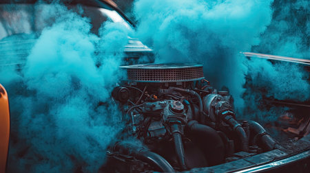A striking close-up of a vintage car engine surrounded by vibrant blue smoke, showcasing the raw power and beauty of classic automotive engineering.