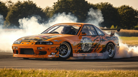 A drift car with bold graphics spinning its rear tires, releasing smoke on a sun-drenched track