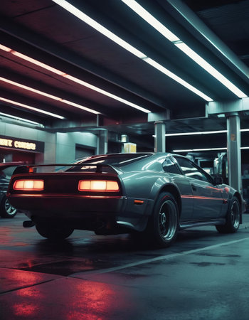 Classic dark blue sports car with stop lights in a dimly lit parking garage with neon lights
