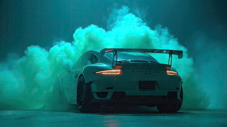 A sports car is the main subject, emerging from a cloud of green smoke. The image features dramatic lighting that creates a moody atmosphere. It appears to be indoors with a focus on speed and performance. Suitable for automotive design, marketing materials, and editorial content.