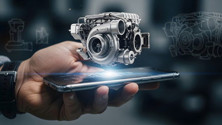 A hand holds a smartphone displaying a detailed holographic 3D model of a car engine turbocharger.