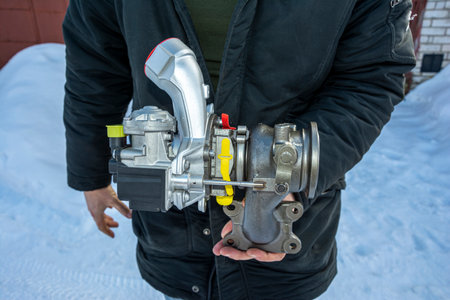 Man hand holding object ( Steel turbocharger ) isolated on white background. High resolution
