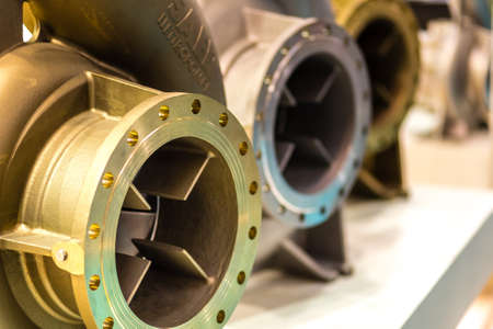 close up detail cross section impeller inside of electric centrifugal pump or blower for industrial