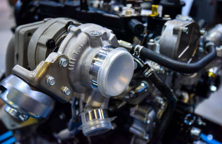 Turbo charger installed on car engine for power booster torque drive. Auto service industry for racing.