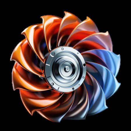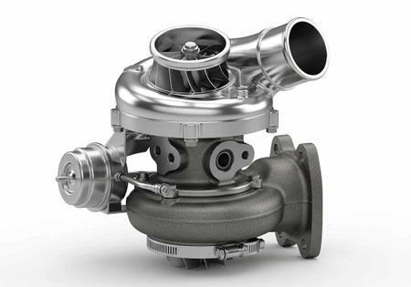 This striking close-up image showcases a modern engine turbocharger turbine wheel, highlighting its intricate design and metallic finish. The detailed blades reflect light, offering a glimpse into advanced automotive technology.