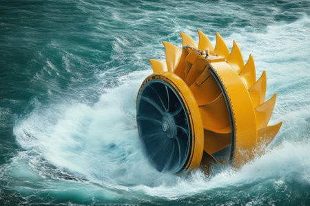 A yellow and black propeller is in the water. The propeller is spinning and creating a lot of waves