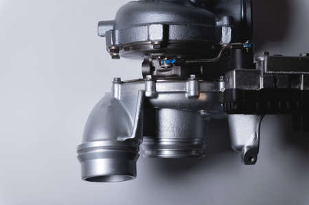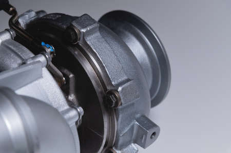 Close-up of an auto part for an internal combustion engine. Gas turbine. Turbo supercharger new on a gray background. Parts background