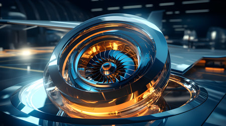 A large, metallic jet engine with a glowing orange and blue design. The engine is surrounded by a dark background with a few blue and white lights. The image conveys a futuristic, technological