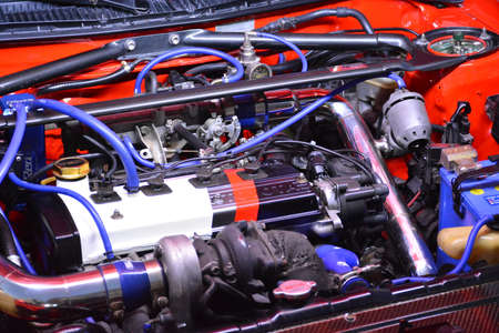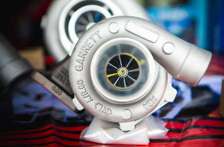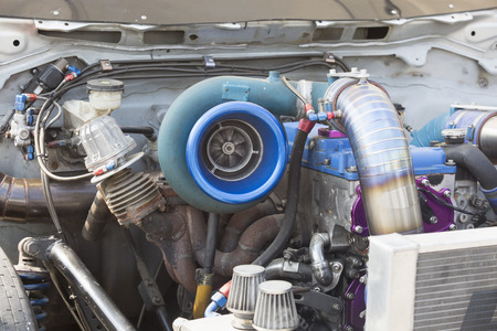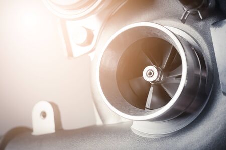 Turbo charger installed on car engine for power booster torque drive. Auto service industry for racing.