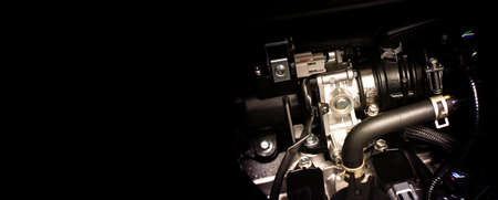 Close up of throttle body of engine drive system in a car with horizontal copy space on black background