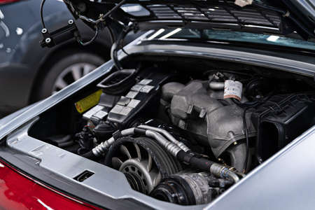 A detail of the sports car engine. It is a historic rallye car from the past.