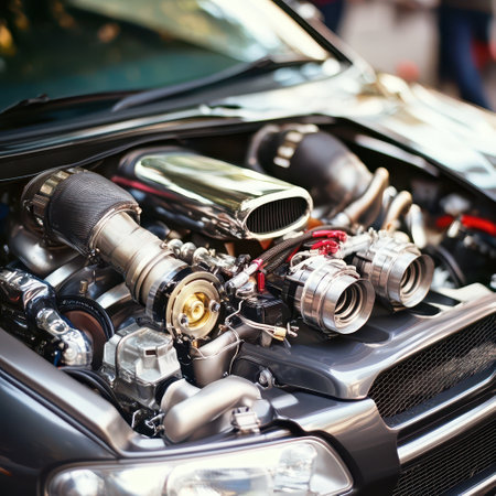 A high performance engine with upgraded components is displayed under the hood of a sleek vehicle in a vibrant automotive setting.