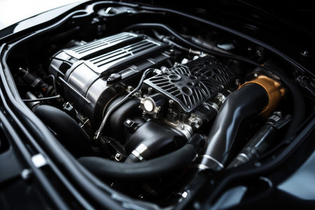 This detailed shot presents a powerful vehicle engine, showcasing its intricate mechanical components. The image features a complex arrangement of parts with a dominant black color palette and accents of red and metallic silver. The composition is likely captured indoors, with a focus on highlighting the engineering and design. Suitable for commercial and editorial purposes.