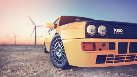 The image in front of the sports car scene behind as the sun going down with wind turbines in the back. 3d render and illustration.