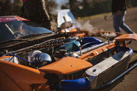 Imola, italy 01 january 2026: custom orange race car engine bay steaming, showing a turbocharger, intercooler, and exposed components after a breakdown