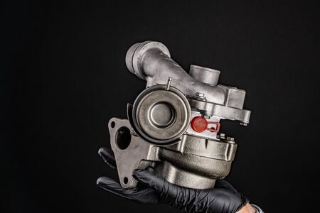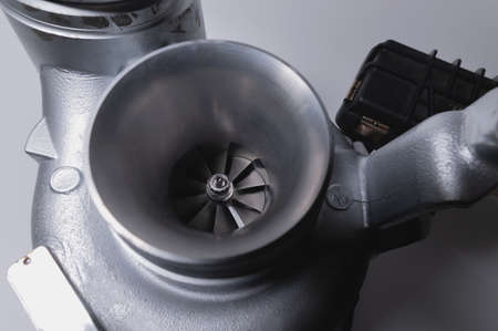 Close-up of an auto part for an internal combustion engine. Gas turbine. Turbo supercharger new on a gray background. Parts background