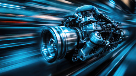 A sleek, powerful engine showcasing meticulously polished piping and striking blue accents, embodied precision engineering and high-speed performance.