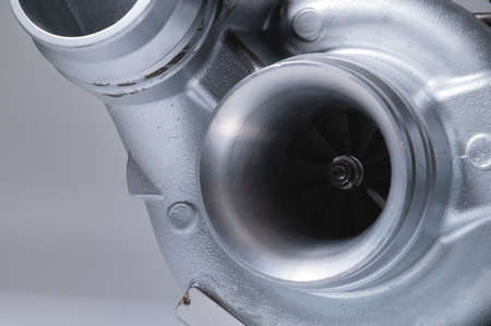 New turbocharged engine on a gray background. Impeller parts