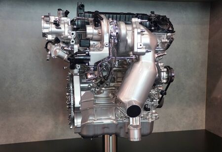Closeup of the new gasoline engine in the modern car for show in the showroom.