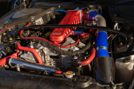 Imola, italy 01 january 2026: powerful modified internal combustion engine of a performance car with aftermarket parts, carbon fiber intake, and turbocharger elements
