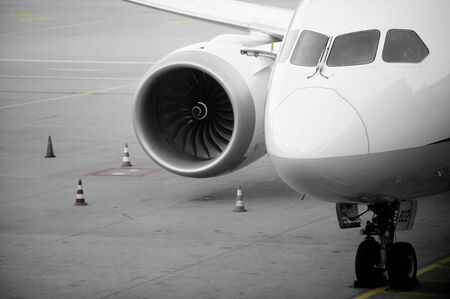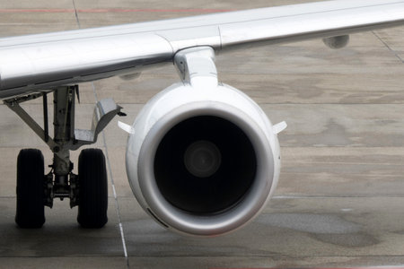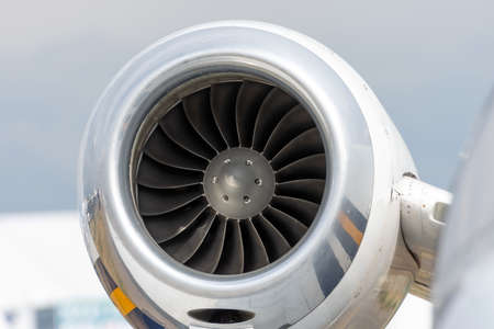 Close up shot of a jet engine of a modern airplane standing on a runway