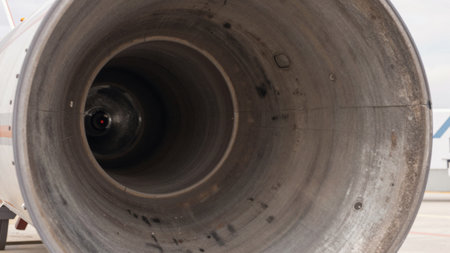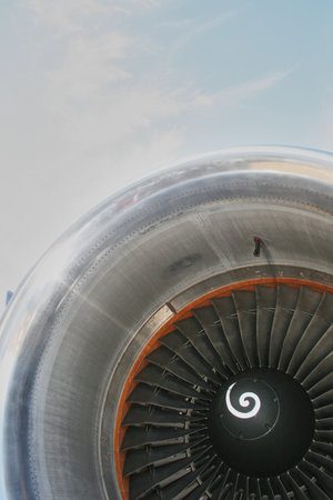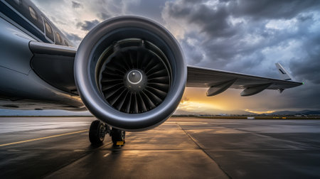 Close-up detail of a powerful jet engine, showcasing its intricate metal components and sophisticated engineering. Illustrates industrial technology, aerospace innovation, and the mechanics of modern aviation. Ideal for concepts related to power, speed, and advanced manufacturing.