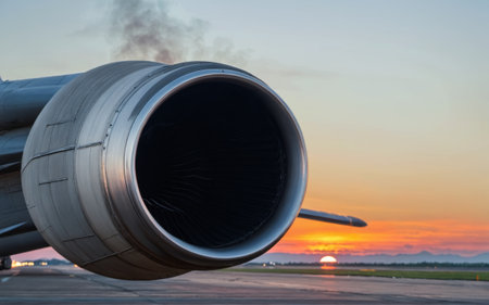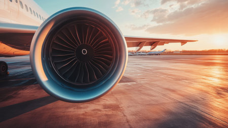 The powerful turbine of an aircraft reflects the warm hues of a stunning sunset. The sky fades from blue to orange, creating a captivating scene at the airport's busy runway.