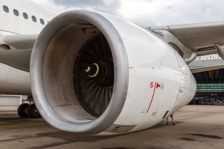 Zurich, Switzerland - July 22, 2020: Swiss Airbus A330-300 Rolls-Royce Trent RB211 airplane engine at Zurich Airport (ZRH) in Switzerland.