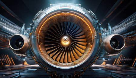The turbine engine features intricate engineering and modern design, dramatically illuminated.