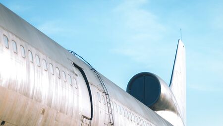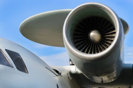 Close up of airplane jet engine, parts of the aircraft fuselage and the tail on cloudy sky background