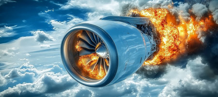 A dramatic close-up captures a burning jet engine erupting in flames during an airplane's takeoff. This striking image showcases intense fire and smoke billowing from the engine, highlighting a critical aviation emergency. The visual emphasizes the raw power and inherent danger of combustion within aircraft technology. Ideal for illustrating flight failure, risk assessment, or showcasing transportation technology. Perfect for editorial, commercial, and educational content related to aviation, airlines, and aeroplanes.