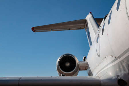 Details of a small airliner ready to fly. The engine, wing and tail of a passenger liner.