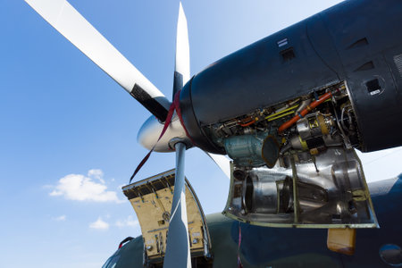 Close up view of a military transport airplane engine