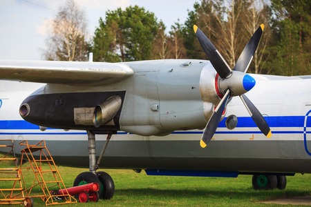 Engine with the propeller of the old passenger aircraft. Close-up fragment of the airplane. Selective focus.