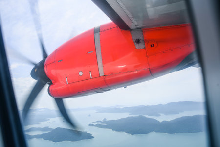 Aeroplane flying over the ocean and turbine detail in movement. Horizontal