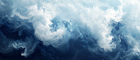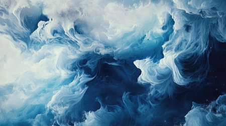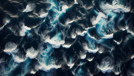 Dramatic depiction of powerful ocean waves crashing with intensity in a turbulent blue sea. the swirling patterns and foamy textures create an abstract, dynamic nature scene, perfect for design, background, or environmental themes. Generative AI